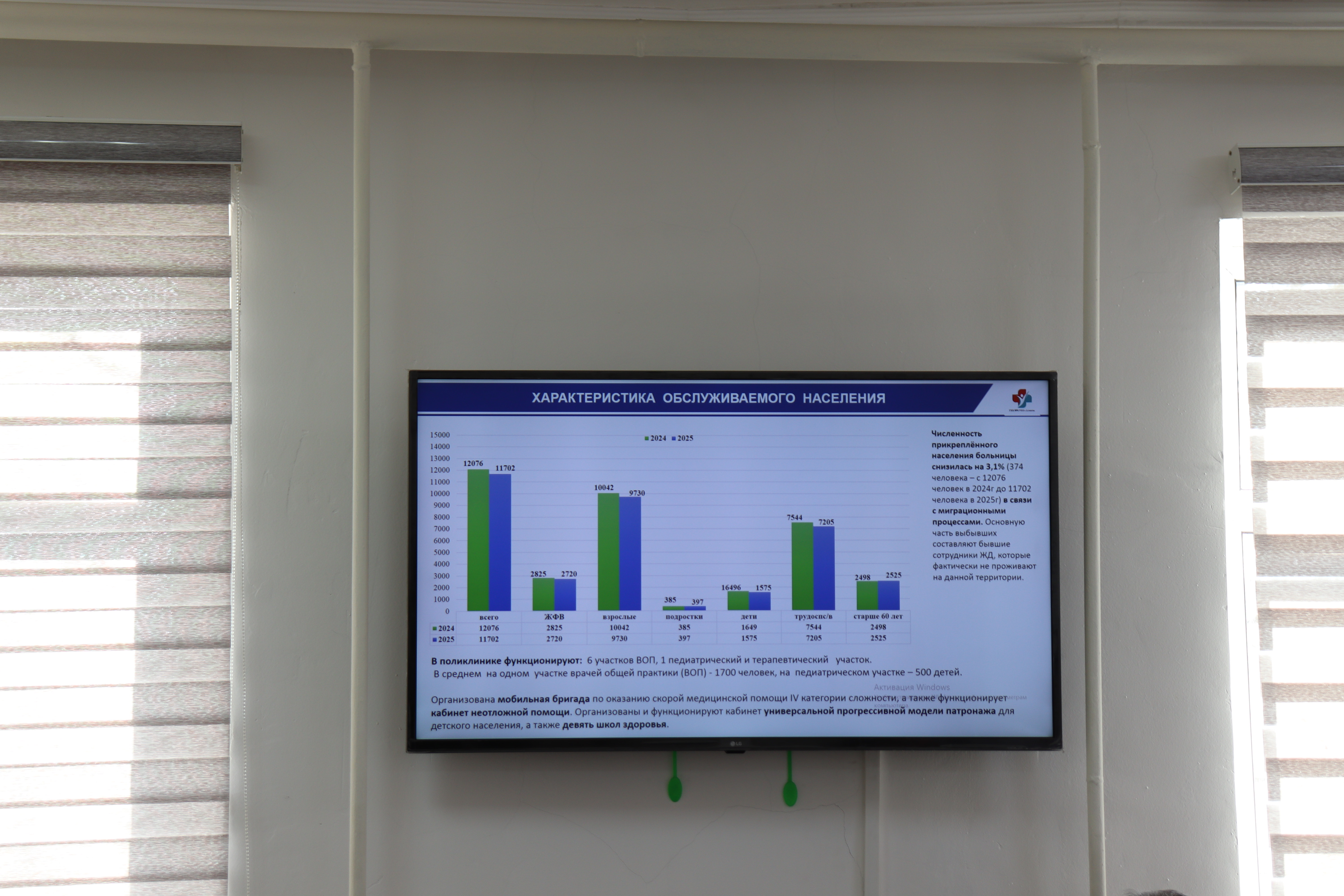 Поликлиника при ГКБ №8 обслуживает порядка 11 тыс прикрепленного населения. Функционируют 6 участков ВОП, 1 педиатрический и терапевтический участок. Доля застрахованного прикреплённого населения в системе ОСМС выросла до 83%. Это результат работы коллектива с населением. При поликлинике организована мобильная бригада по оказанию скорой медицинской помощи IV категории сложности, а также функционирует кабинет неотложной помощи. Организован кабинет универсальной прогрессивной модели патронажа для детского населения, а также девять школ здоровья. При ПМСП ведется диспансерный учет пациентов с хроническими заболеваниями, организованы профилактические осмотры населения по возрастам, действует программа управления заболеваниями по артериальной гипертензии, сахарному диабету и сердечно-сосудистым заболеваниям.