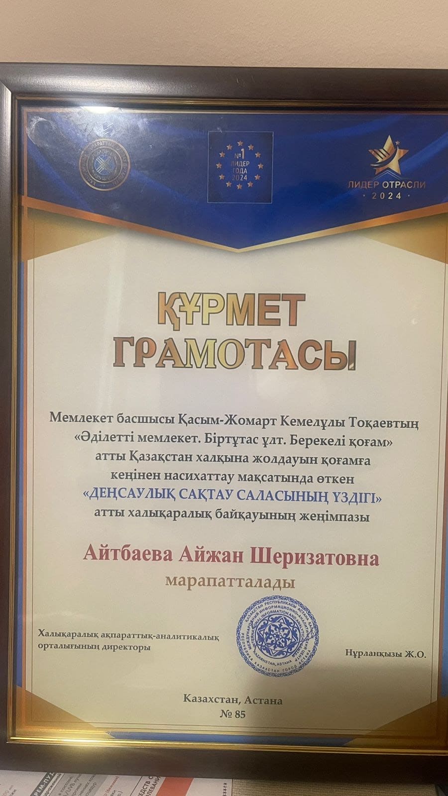 Айжан Шеризатовна награждена почетной грамотой: «Мемлекет басшысы Қасым-Жомарт Кемелұлы Тоқаевтың Әділетті мемлекет. «Біртұтас ұлт. Берекелі қоғам.» атты Қазақстан халқына жолдауын қоғамға кеңінен насихаттау мақсатында өткен «ДЕНСАУЛЫҚ САҚТАУ САЛАСЫНЫҢ ҮЗДІГІ» атты халық аралық байқауның жеңімпазы».